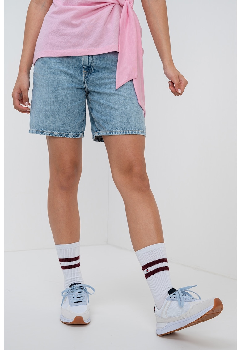 Caracteristici Culoare: albastru deschis Imprimeu: uni Croiala: dreapta Material: bumbac, denim Talie: joasa Lungime: scurti Buzunare: 5 buzunare Sistem inchidere: fermoar Compozitie Exterior: 70% bumbac, 30% bumbac reciclat Info model Modelul poarta un produs de marimea 27. Marimi model: 174 cm inaltime, 84 cm bust, 63 cm talie, 91 cm sold