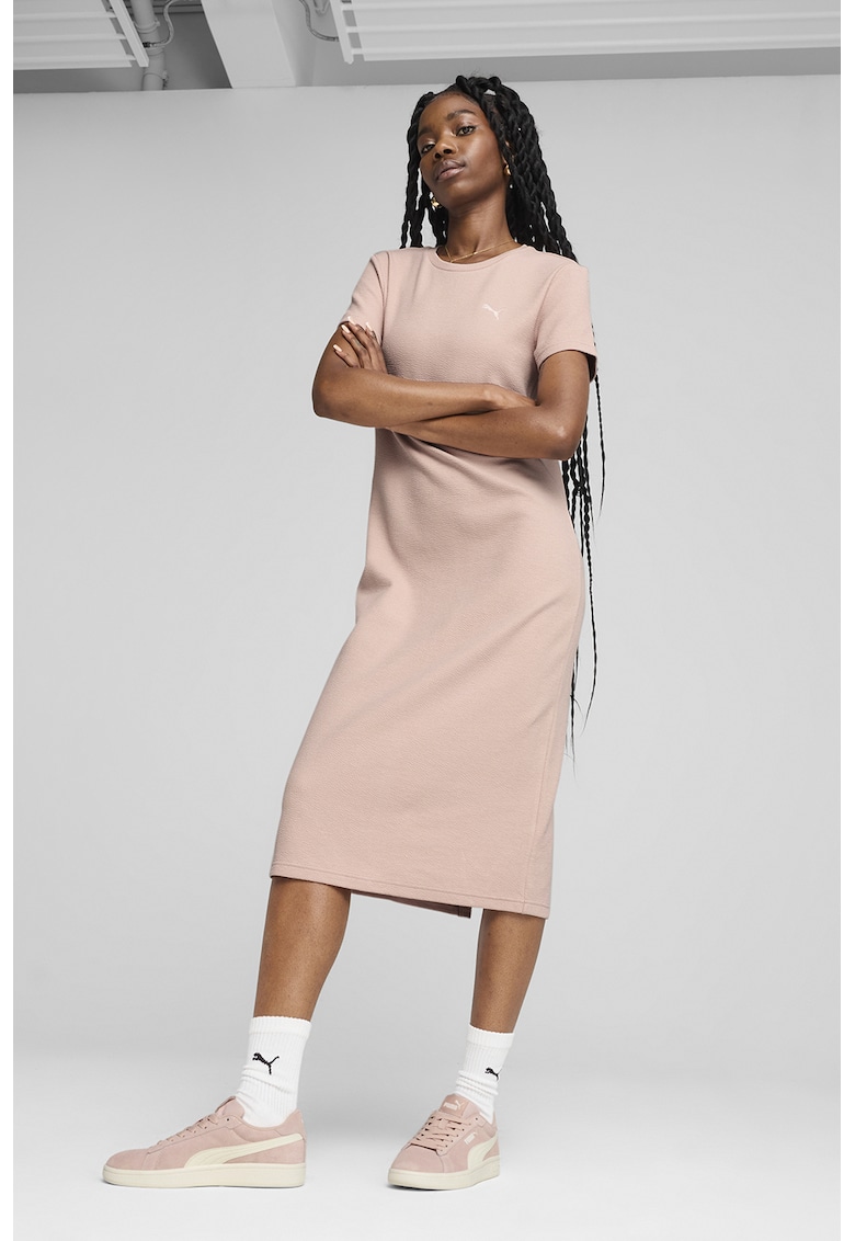 Caracteristici Culoare: roz deschis Stil: casual Material: poliester, bumbac Imprimeu: uni Croiala: dreapta Lungime: midi Decolteu: la baza gatului Lungime maneca: maneca scurta Compozitie Exterior: 61% bumbac, 34% poliester reciclat, 5% elastan