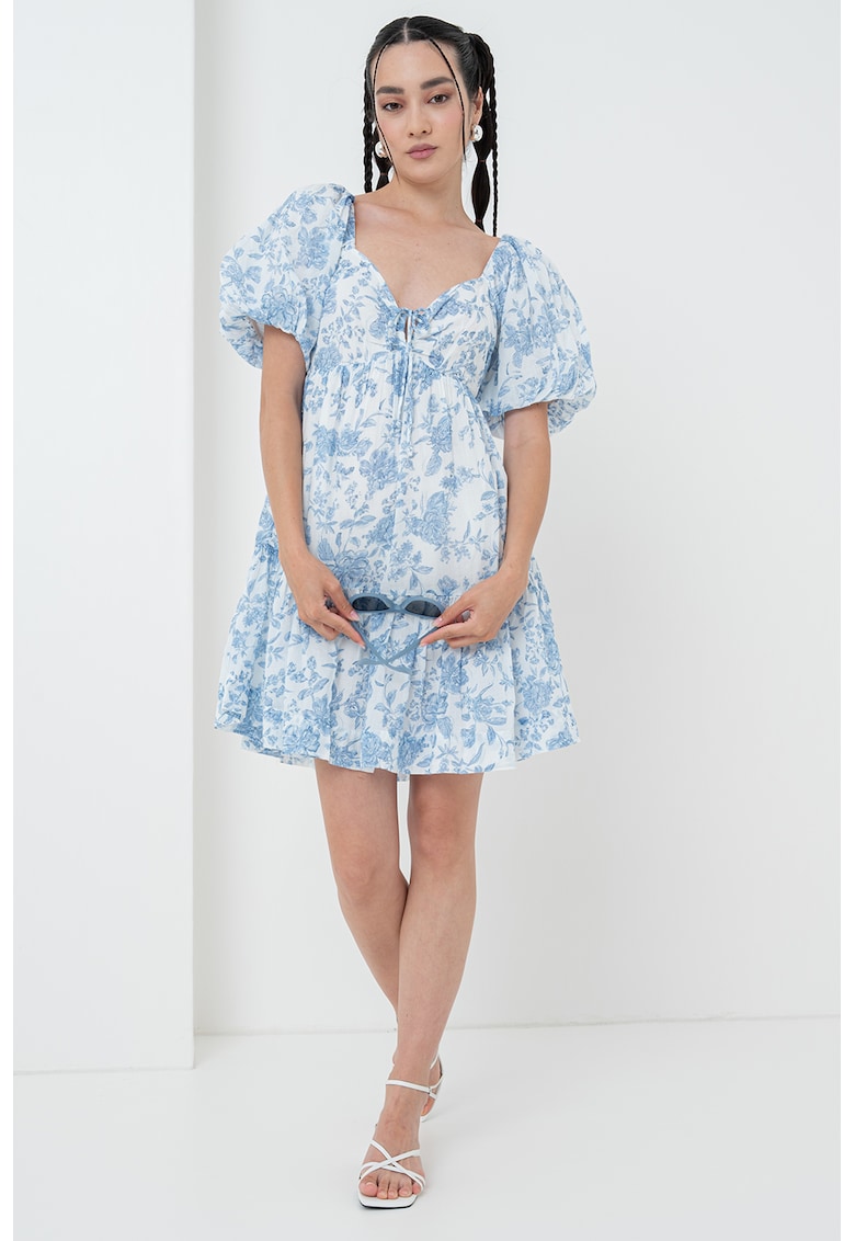 Caracteristici Culoare: albastru Stil: casual Material: bumbac Imprimeu: floral Croiala: evazat Lungime: scurta Decolteu: in v Maneci: bufante Lungime maneca: maneca scurta Detalii: terminatie cu volan Compozitie Exterior: 100% bumbac Info model Modelul poarta un produs de marimea S. Marimi model: 170 cm inaltime, 78 cm bust, 60 cm talie, 99 cm sold